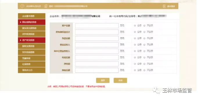 根据审计报告、资产负债等如实填写企业资产状况,若选择“公示”则对外公示,若选择“不公示”,则公示查看该指标不对外公示,显示“不公示”。