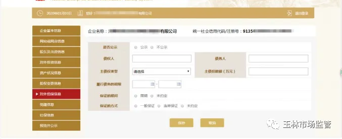 填写对外担保信息。点击左边的对外担保信息,根据实际情况进行添加之后点击“保存”。如无对外担保情况的则无需填写此项信息。
