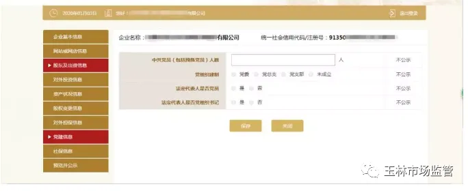 填写党建信息。党建信息为不公示信息,主要采集私营企业党组织的建立情况,但属于抽查范围,请注意如实填写。其中,中共党员(包括预备党员)人数,为截至年度报告年份12月31日的人数。如企业暂无党员,填写“0”人后点击保存即可。