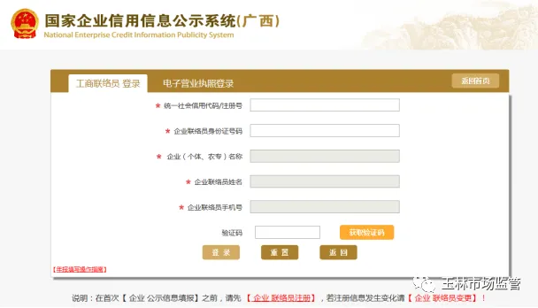 在“统一社会信用代码/注册号”栏内填写统一社会信用代码,企业名称会自动弹出,在“工商联络员身份证号码”栏内输入联络员身份证号码,鼠标左键在页面空白处点击一下,3-5秒后,工商联络员姓名及手机号码会自动显示出来,然后点击“获取验证码”,收到验证码后输入,点击“登录”。