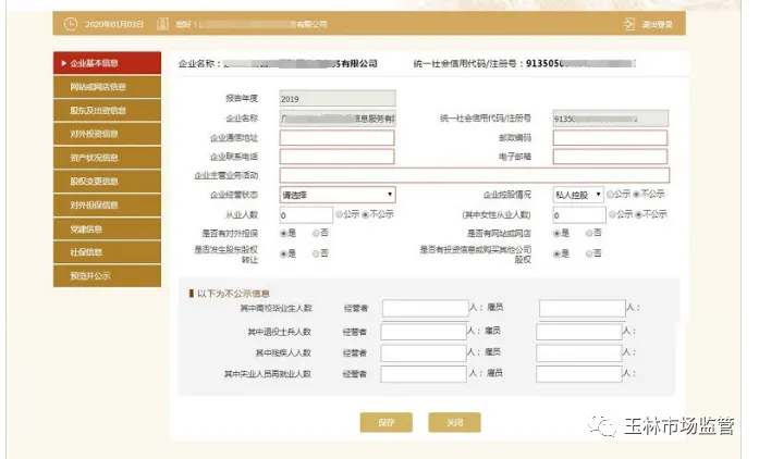 填写基本信息。需要填报的通信地址、邮政编码、联系电话、电子邮箱、存续状态、网址、网站信息均为报送时的信息,其余信息为所报告年度12月31日的信息。如果有网站、对外担保,就点“是否有网站或网店”后面的“是”字前的圆点,如果没有网站、对外担保就点“否”字前的圆点。填写完后点“保存”。在填写基本信息时,可根据具体情况选择“是否有网站或网店”、“是否有对外担保”,“本年度是否发生股东股权转让”,“是否有投资信息或购买其他公司股权”。若选择“是”,则会在页面上增加相应的“网站或网店信息”、“对外担保信息”等,反之,则没有“网站或网店信息”、“对外投资信息”等的填写页面。