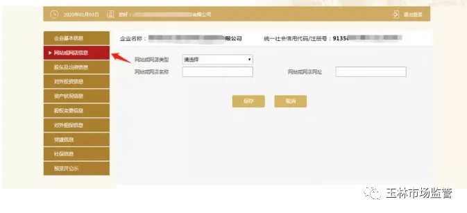 填写网站或网店信息。如在基本信息页面“是否有网站或网店”选择“是”,则出现网站或网店填报页面,点击“添加”按钮,弹出添加网站或网店页面,如下图所示。填写后点击保存。