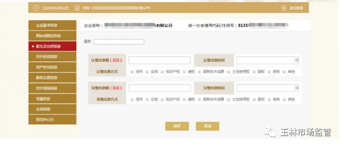 填写股东及出资信息,点击“添加”进行填写。(分公司无需填写)按照公司章程上约定的填写股东出资额及出资时间,每一个股东(发起人)的出资信息只需填报一条,股东(发起人)认缴和实缴出资额为截至报告年度12月31日的累计数额;认缴和实缴出资时间为截至报告年度12月31日最后一次认缴和实缴时间,出资方式可以多选。点击“保存”。如还未发生实缴,则实缴部分暂时不需填写,填写认缴信息后即可保存。注意:系统默认填写数额单位为万元,填写时要注意核对数额大小准确性!只填写数字即可,不要在数字后面加“万”字,否则不能保存。