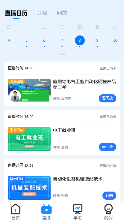 b.直播课堂是单独一个模块,可以通过日期选择查看更多直播内容,并增加筛选按钮,可以筛选想要观看的直播课类型。支持订阅直播以及支持直播回放,再也不怕漏掉了老师的直播课。