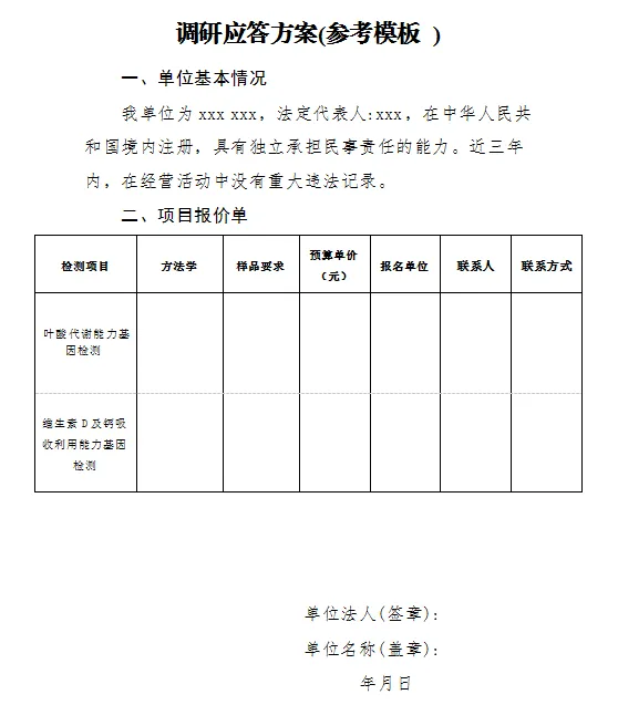 天津市滨海新区新村街社区卫生服务中心拟开展叶酸代谢能力基因检测、维生素D及钙吸收利用能力基因检测项目,现对基因检测项目市场调研,欢迎符合条件的供应商前来报名参加。
