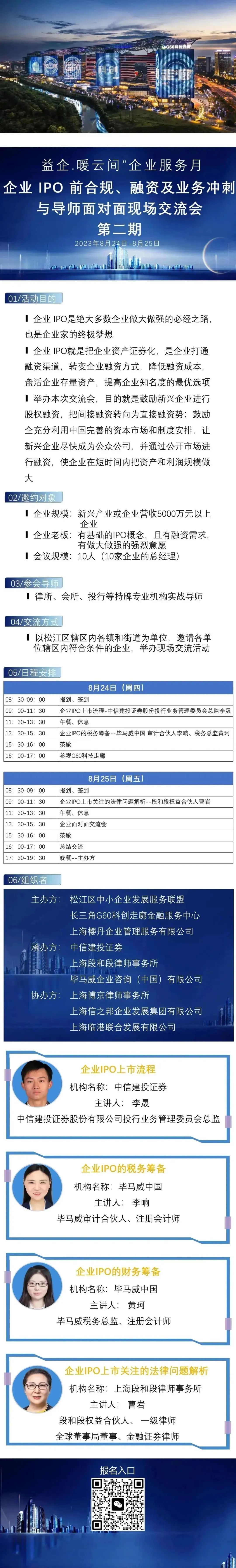 为进一步为松江区优质企业提供金融赋能与资本市场全周期服务,形成长效金融赋能生态圈,推动更多优质企业登陆资本市场,8月24日至25日,将在G60科创云廊举办“‘益企·暖云间’企业服务月活动之松江拟上市企业IPO辅导第二期”。本次活动由松江区中小企业发展服务联盟、长三角G60科创走廊金融服务中心、上海樱丹企业管理服务有限公司主办,中信建投证券、上海段和段律师事务所、毕马威企业咨询(中国)有限公司共同承办,上海博京律师事务所、上海信之邦企业发展集团有限公司、上海临港联合发展有限公司协办。