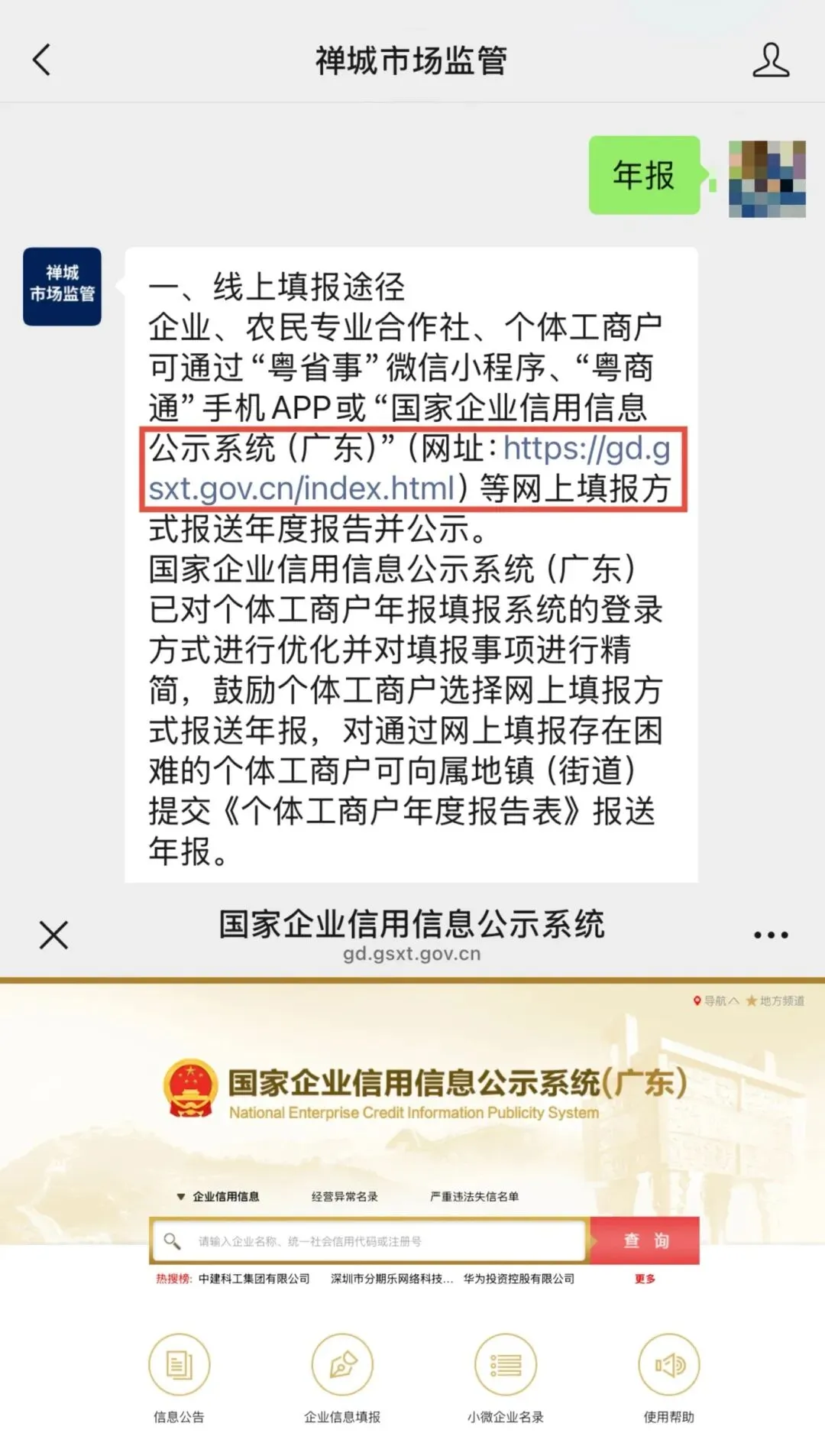 关注官方公众号“禅城市场监管”,回复关键词【年报】,点击网络链接直接跳转到“国家企业信用信息公示系统”页面。