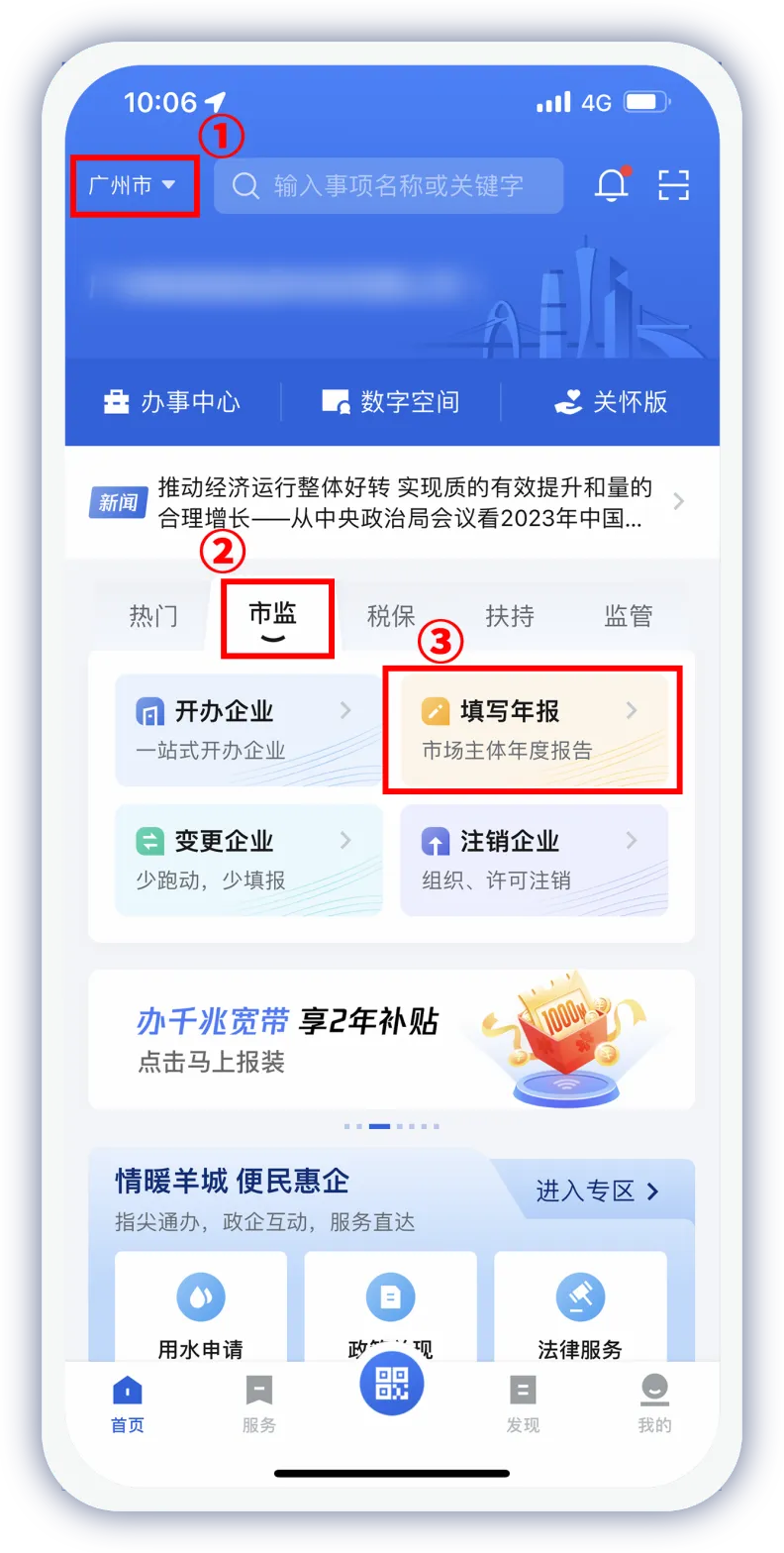 将首页左上角位置信息切换至企业/个体户/农专所在城市,点击【市监】—【填写年报】—【年度报告填写】,完成人脸识别验证。