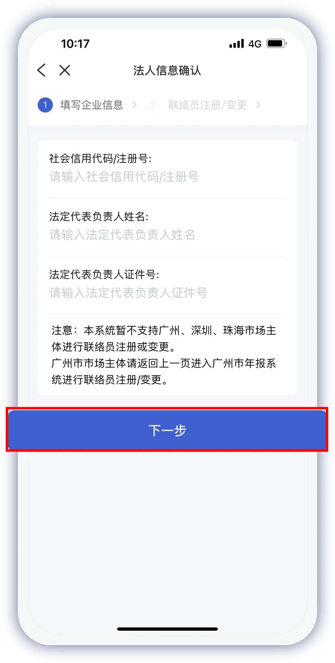 录入企业统一社会信用代码/注册号、法定代表人/(负责人)的姓名和身份证号码、联络员的姓名、身份证号、手机号码等信息后保存。