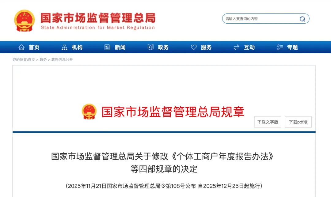 自2025年12月25日起,《国家市场监督管理总局关于修改〈个体工商户年度报告办法〉等四部规章的决定》开始施行。