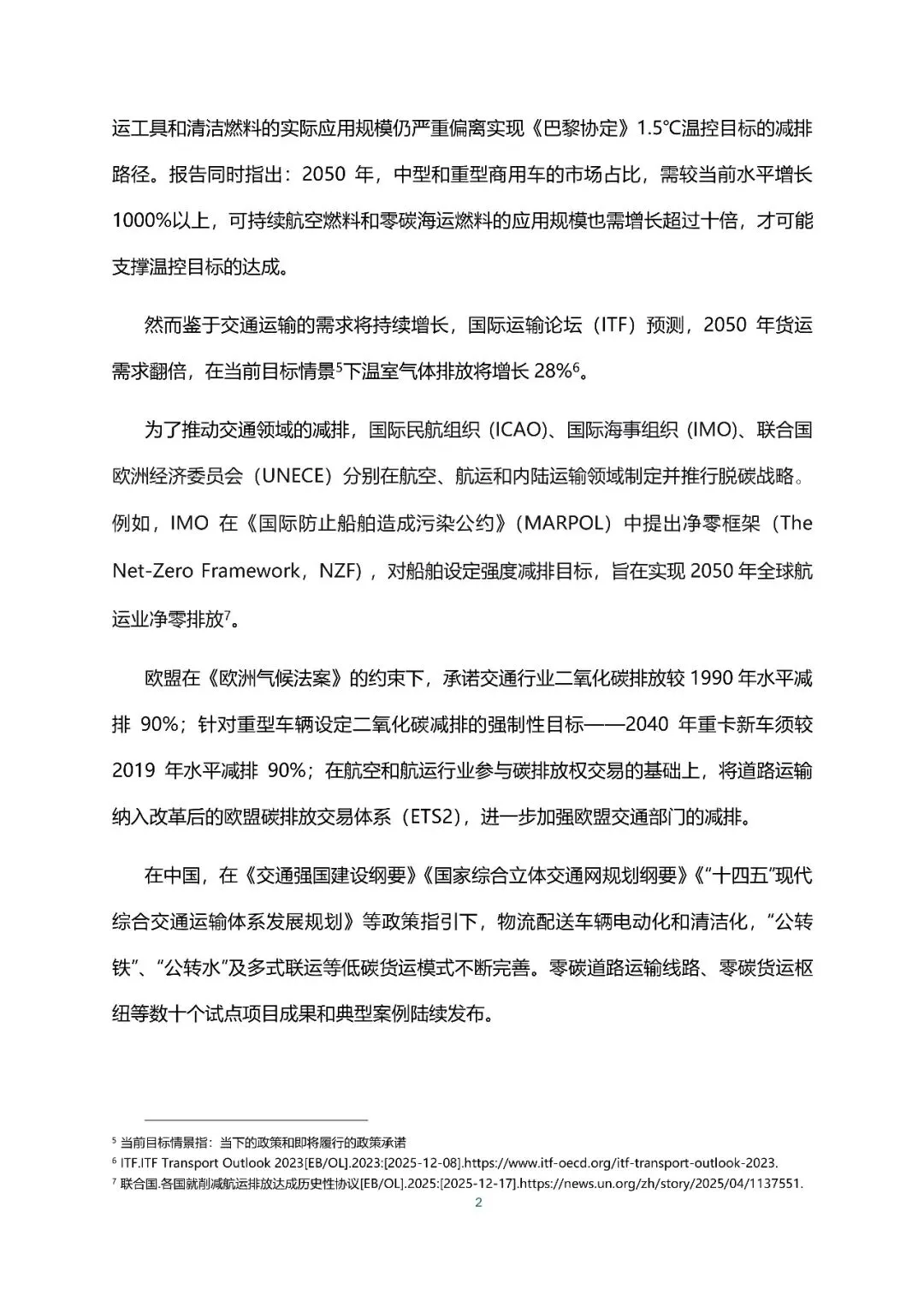 在全球应对气候变化、推进绿色低碳转型的背景下,交通运输作为关键排放源之一,脱碳进程至关重要。尽管各国已出台多项脱碳战略与政策,但当前进展仍偏离实现《巴黎协定》1.5℃温控目标所需路径1 。为推推动交通域的的排排,盟在在《盟 气候法案》的约束下,承诺交通行业二氧化碳排放较 1990 年水平排排 90%。中国在“双碳”目标指引下,持续推动车辆电动化和清洁化,发展低碳货运模式,同时促进交通物流降本提质增效。