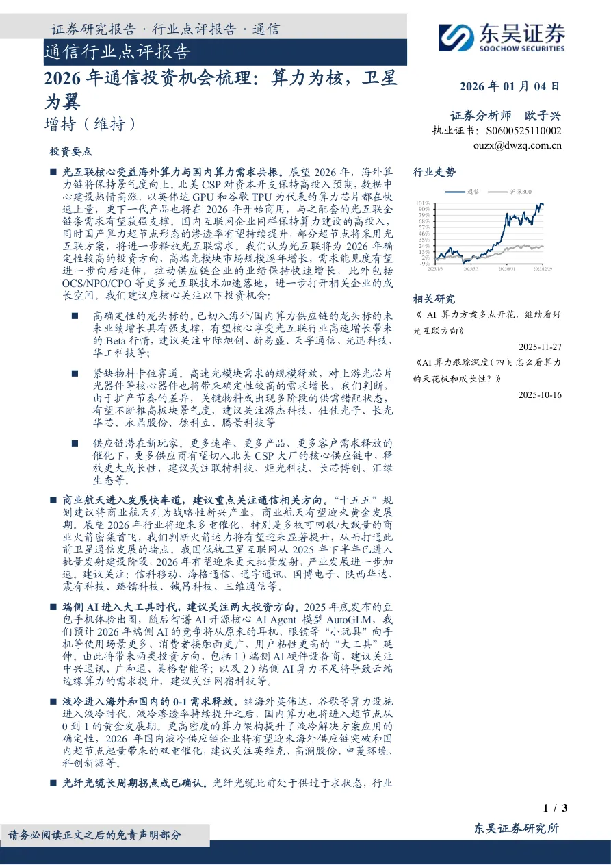 3. 端侧AI:2026年竞争将从“小玩具”向手机等“大工具”延伸,带来两类投资机会,一是中兴通讯等端侧AI硬件设备商,二是网宿科技等受益于边缘算力需求提升的企业。