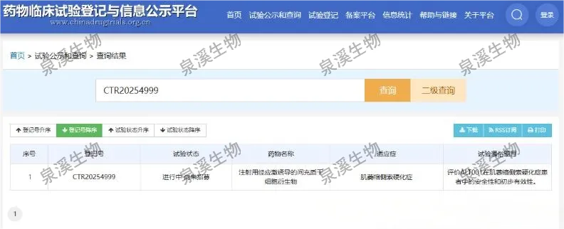 近日,国家药物临床试验登记与信息公示平台展示,初步评估ALT001用于肌萎缩侧索硬化症(ALS,渐冻症)安全性和诊断的Ⅰ期临床试验已启动,登记号CTR20254999.首次公示时间为2025年12月19日。