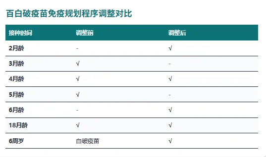 2025年1月1日,根据国家疾控局等六部门联合印发的《关于国家免疫规划百白破疫苗和白破疫苗免疫程序调整相关工作的通知》,实施了多年的百白破疫苗接种程序发生了关键性变更。程序由原来的“3、4、5、18月龄”接种百白破疫苗,加上6周岁接种一剂白破疫苗,全面调整为“2、4、6、18月龄及6周岁”各接种一剂次百白破疫苗。