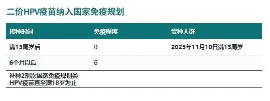 2025年11月10日HPV疫苗正式纳入国家免疫规划。根据国家疾控局等7部门《关于将人乳头瘤病毒疫苗纳入国家免疫规划有关工作事宜的通知》(国疾控卫免发〔2025〕16号)文件规定:自该日起,为2011年11月10日以后出生的满13周岁女孩免费接种2剂次双价HPV疫苗。