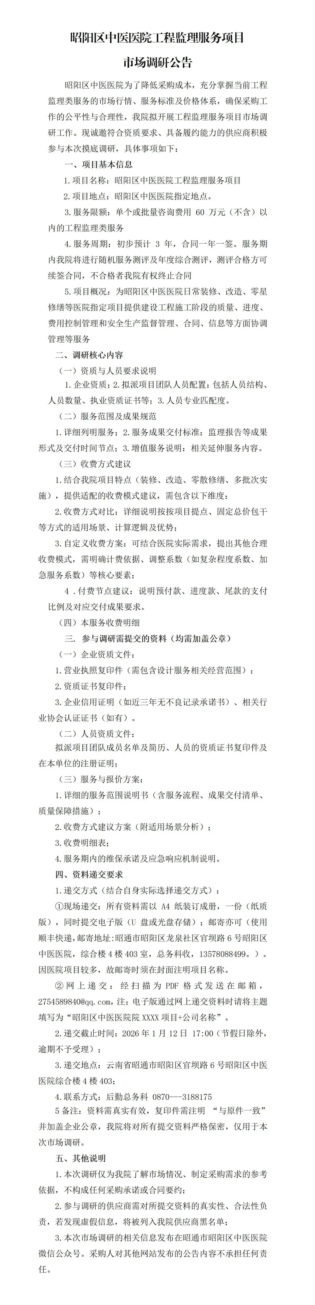 昭阳区中医医院工程监理服务项目市场调研公告