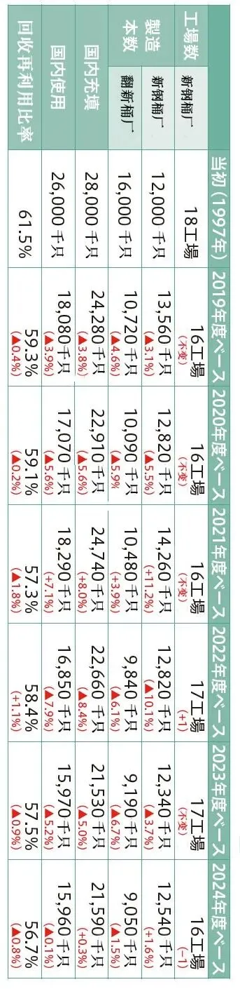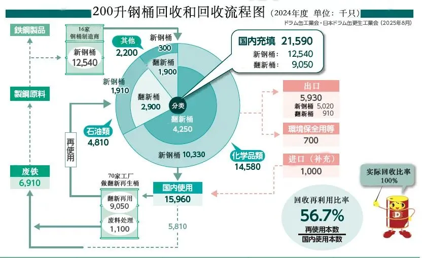 从图1我们了解到,在日本钢桶筒在使用后,一部分被回收给再生桶制造商,一部分被用户直接回收给废铁处理商。钢桶可以重复使用(再利用),并且建立了回收(再利用)系统,可以说是循环型再利用的典范。图1为2024年度版200l钢桶回收利用流程图。钢桶的再利用比率为56.7%,除去环保桶的话,作为资源的再利用比率实际上为100%。
