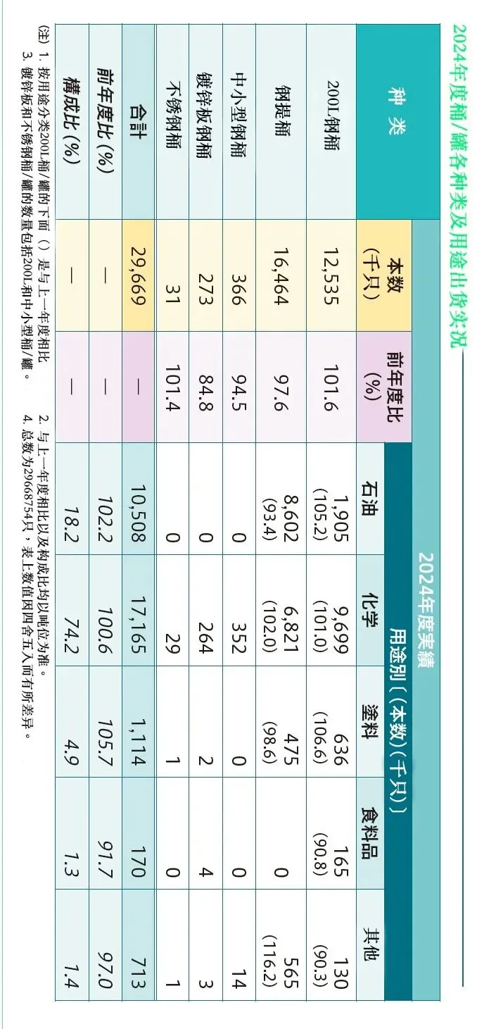 从用途来看,200升新钢桶2024年度比上一年度(2023年度)在化工包装方面增长了1%,增加了95000只钢桶;在石油行业用桶增长了5.2%,增加了94000只新钢桶,在涂料行业用桶增长了6.6%,增加了39000只新钢桶,食品行业用桶减少了9.2%,减少新钢桶17000只,其他行业用新桶减少了9.7%,减少新钢桶数量14000只。
