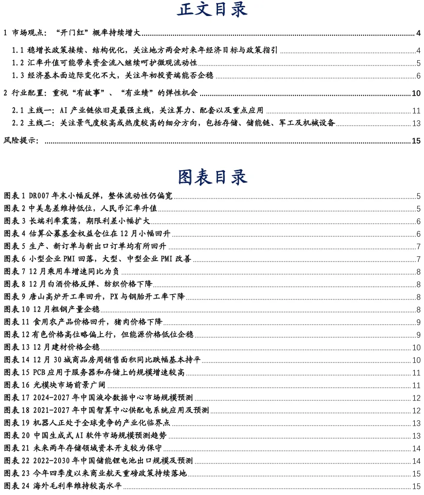 中央经济工作会议和美联储议息会议前,预期扰动市场呈波动态势,随着重大会议落地,市场稳步上涨。12月上证指数和创业板指均小幅收涨。行业层面,结构化特征显著,主题和景气机会为主,其中商业航天异军突起并辐射设备类领域、领涨市场。各品种金属景气显著提升、涨幅居前。AI算力和机器人应用强势领涨。但消费品和泛高股息行业表现不佳、跌幅靠前。展望1月,积极因素不断累积,“开门红”可能性持续增大,积极把握新一轮进攻时机。配置思路上,风险偏好持续改善,弹性将成为首要考虑,而“有故事”、“有业绩”是上涨弹性充分表现的前提,按照这两个方向进行梳理,其中既有故事又有业绩的AI产业链仍是最强中心主线,有望取得最亮眼表现;有故事的热门主题同样具备良好弹性,向上的市场环境为主题弹性提供营养土壤;此外有业绩的部分景气领域亦值得重视。建议关注以下两条主线机会:第一条主线是产业景气趋势需再次强调的AI产业链,可关注算力(CPO/PCB)、配套(光纤/液冷/电源设备)、应用(机器人/游戏/软件)等。以算力基建为核心的新一轮成长产业景气趋势已被证实,产业主线“强者恒强”是历史规律。我们在年度策略和一季度策略专题中证实目前处于产业景气行情第一阶段后期,中长期维度可期待第二阶段业绩支撑和第三阶段估值泡沫化行情,短期维度也可期待成长风格的一轮加速化行情和各成长风格行业同创新高。第二条主线是景气支撑或重大事件催化下的部分领域,重点关注存储和储能链条(储能/电池/能源金属/锂电材料)、军工、机械设备等。其中存储近期受供给扰动价格大涨,后续有望叠加AI需求提振,景气将长期上行。储能链在于终端尤其是海外储能需求超预期,带动整个产业链景气上行。军工一方面受益商业航天和地缘政治事件催化,另一方面也将受益创业板上涨情绪驱动。机械设备一方面受益工程机械景气持续改善,另一方面受益机器人、商业航天对设备类机会的辐射。