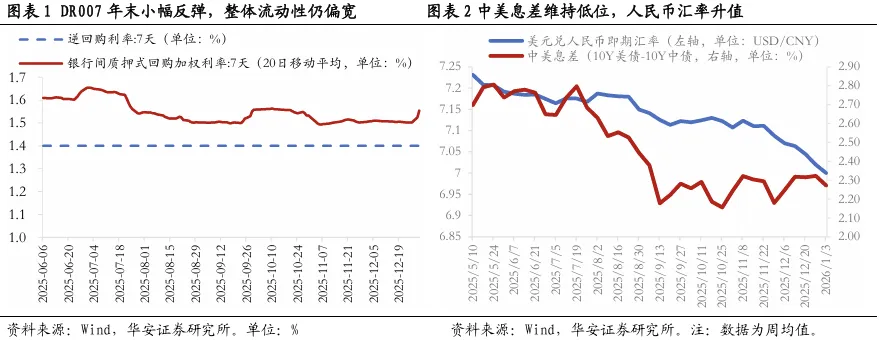 1月存降准可能,降息有待观察。2025年末中央经济工作会议对货币政策“适度宽松”的定调维持不变,具体表述基本与先前保持了一致,继续“把促进经济稳定增长、物价合理回升作为货币政策的重要考量”,同时“灵活高效运用降准降息等多种政策工具”,结构上仍侧重于向“扩大内需、科技创新、中小微企业等重点领域”发力。但进入1月份,外部掣肘减弱、货币政策空间打开,降准概率有所提升。①从国内看,四季度稳增长压力持续显现,如1月中旬公布的2025年四季度GDP增速明显回落,则开年“开门红”诉求下,可能配合投资端止跌回稳、扩大财政支出,以降准方式提供流动性。②美元兑人民币汇率2025年末升破“7”关口,宽松面临外部掣肘大幅减弱。③考虑到银行净息差处于历史偏低水平,降息概率低于降准。