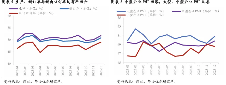 经济基本面边际变化不大,关注年初投资端能否企稳。12月已公布高频数据显示基本面边际变化不大,价格水平止跌回稳、出口维持中高景气,消费、地产等内需依旧承压,但值得注意的是建筑业PMI大幅回暖、建材价格出现企稳迹象,或表明年初投资端有望在政策发力下企稳。预计12月社零同比增长1.6%左右,固定资产投资累计同比增长-2.2%,其中制造业投资累计同比2.1%、基建投资增速0.1%、地产投资增速-15.5%,出口同比1.8%;12月CPI同比0.9%、PPI同比-2%。PMI重回荣枯线上方。12月制造业PMI为50.1%,较上月回升0.9个百分点,重回荣枯线上方。①供需两端小幅回暖,外需更加明显。12月生产、新订单和出口订单指数分别为51.7%、50.8%和49%,新出口订单回升(1.4个百分点)较为明显。②就业小幅回落,压力依然较大。12月从业人员为48.2%,较上月下降0.2个百分点,指数仍在低位徘徊。③服务业小幅回暖,建筑业景气度明显修复。12月份,服务业PMI为49.7%,较上月回升0.2个百分点。建筑业PMI较大月大幅提升3.2个百分点至52.8%,或表明基建开工有所修复、企业预期有所改善。从不同企业类型的PMI来看,大型企业、中型企业明显回升,小型企业则有所走弱
