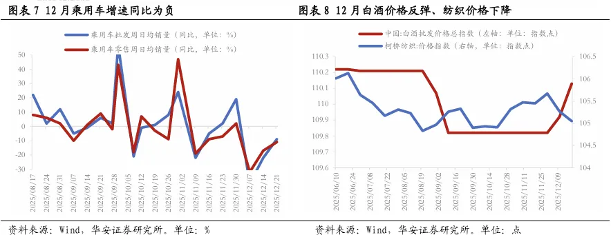 2025年末消费再度走弱,有待2026年“以旧换新”政策接续。12月前三周乘用车批发和零售当周日均销量平均值分别为6.19万辆和6.18万辆,同比分别下降22.5%和18.8%,均较上月明显下降,指向年末消费再度走弱。商品价格有所分化,临近元旦假期全国白酒批发价格指数反弹至110.13,柯桥纺织指数小幅回落至105.3。可选服务类消费偏弱:因2026年春节相对较晚,12月海南旅游消费总指数同比下降1.6%,降幅较上月淡季基本持平;12月热门影片支撑下,电影票房周均收入较上一年年同期上涨48%、但涨幅较上月明显收窄。目前来看,去年四季度为消费品“以旧换新”政策效果显现期,整体基数偏高,而2025年末补贴资金逐步消耗殆尽,社零增速恐继续小幅下降至1.5%左右,有待2026年补贴政策接续。财政部已明确2026年继续支持汽车报废更新、汽车置换更新、家电以旧换新、数码和智能产品购新,补贴资金在年初到位后有望对消费形成新一轮拉动。