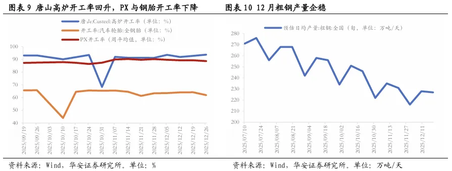 出口景气度边际回落但处于高位,生产端整体持平。12月前四周周均集装箱吞吐量为639万标准箱,环比较上月回落,同比增速7.8%较上月增速10.2%回落,出口景气度边际回落但处于中高水平。典型工业品开工率分化,汽车全钢胎开工率从月初63.5%回落至62%左右,PX开工率小幅下降至88.5%左右,唐山高炉开工率从91%升至93%左右。12月钢材预估日产量企稳于227万吨/天、结束了下降趋势。去年高基数可能拖累出口增速,叠加西方年末佳节结束,而临近国内春节工人陆续返乡,生产端季节性放缓。预计12月工业增加值增速大致在4.9%左右