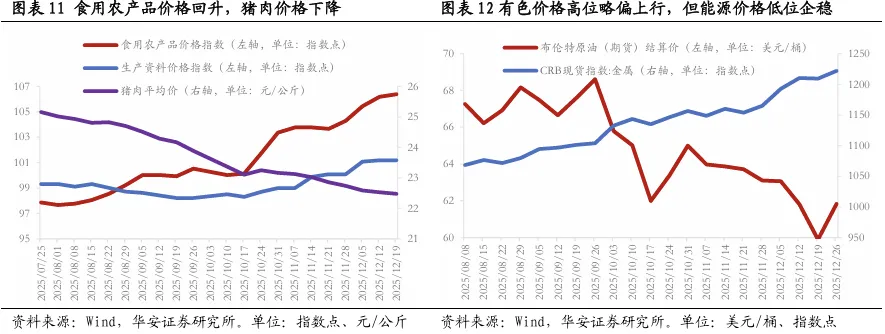 通胀方面,预计12月CPI同比涨幅继续抬升、PPI降幅小幅收窄。猪肉价格维持相对低位,12月前三周猪肉平均价22.59元/公斤,环比上月均值下降0.46元/公斤,与去年同期均值同比下降19.16%、降幅较上月基本持平。12月受天气因素影响,食用农产品价格指数继续反弹、支撑CPI反弹,出行、酒店等服务类领域价格变化不大,对CPI拖累减弱。预计12月CPI同比涨幅抬升至0.9%左右。国际大宗品方面,对后续全球供给扰动担忧以及美联储降息预期支持,有色金属价格高位延续上行,而油价低位企稳。国内大宗品方面,冬季保供推动国内Q5500煤炭价格回落至750元/吨左右。考虑基数影响后,预计12月PPI同比降幅约-2%左右,降幅较上月小幅收窄。