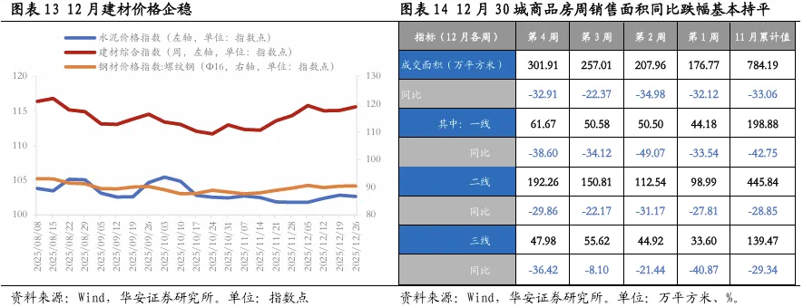 投资端边际企稳。12月建材价格企稳、出现积极变化,预计12月固投有望小幅企稳,得益于年末政策性金融工具托底投资端效果有所显现。缺乏调控政策优化托底,Wind口径下30个大中城市12月周平均新房销售面积同比下降30.7%、降幅较上月小幅收窄2.4个百分点。我们认为,在缺乏增量政策情况下,地产依然难以企稳。尽管北京放松了限购门槛,但核心区并未打开,对市场信心提振较为有限。财政部、税务总局发布公告,自2026年起,个人将购买不足2年的住房对外销售的,增值税征收率从此前的5%下调至3%,满两年及以上的免征增值税,但对交易成本影响较为有限。当下房价低迷依然是购房者观望的重要原因,当前房价依旧呈现快速下行态势。从代表性房价走势来看,11月一线城市二手住宅销售价格环比下降1.1%,降幅比上月扩大0.2个百分点。其中,北京、上海、广州和深圳分别下降1.3%、0.8%、1.2%和1.0%。二、三线城市新建商品住宅销售价格环比分别下降0.3%和0.4%,降幅均收窄0.1个百分点。