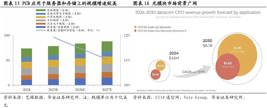 (1)CPO、PCB直接受益于智算中心建设需求快速增长。AI服务器以及智能电车等领域成为PCB板强劲的需求来源,且相关PCB部件价值及毛利提升明显。据Prismark数据,2025年全球PCB市场三大增长支柱分别为AI服务器、高速通信设备以及智能电车,其中应用于AI服务器的PCB年复合增长率预计将达到32.5%,显著高于行业整体增速;价值方面,由于制程及工艺等原因,算力卡上应用的PCB价值明显高于传统服务器,应用于智能驾驶的高端PCB板(HDI)毛利也相较传统面板有较大提升。未来PCB相关板块将持续受益于人工智能发展,量价齐升带动业绩长期向上。CPO在算力集群建设中的需求弹性可观,规模有望持续高增。AI数据中心使用光模块的数量会随着集群规模扩大以及网络层级的提升而呈非线性增长,小规模集群中光模块与GPU比例为1:2.5,在万卡级集群中配比可达1:5~1:10,这意味着随着GPU使用量的增长,CPO将呈倍数级增加。据YoleGroup报告预测,随着光模块技术不断趋于成熟以及数据中心的增长,CPO市场规模将从2024年4600万美元增长至2030年的81亿美元,年复合增长率将高达137%。