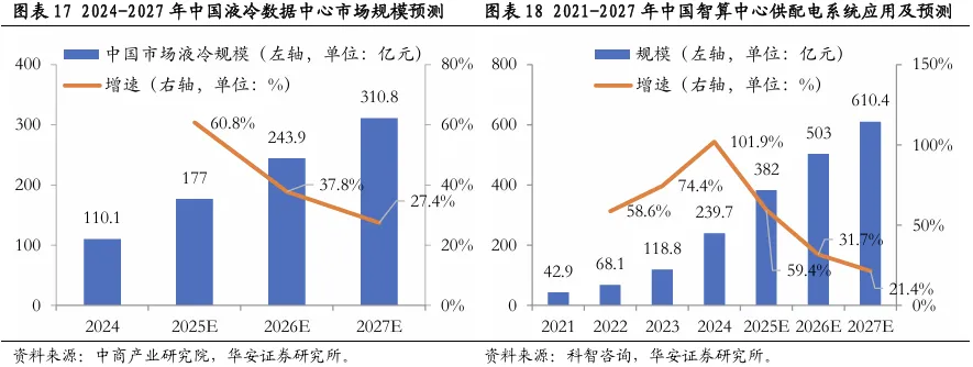 (2)算力配套如光纤、液冷、电源设备等有望成为新需求增长极。光纤产业迭代加速,空芯光纤等新型产品有望进入奇点时刻。空芯光纤、多芯光纤等新型光纤迎来快速发展期。其中空芯光纤以空气为传输介质,具备低时延、低非线性效应以及低损耗的特征,能满足多个应用场景,效果较传统光纤大幅提升。微软于2024年底宣布加速部署空芯光纤,2025年7月国内首条反谐振空芯光纤商用线路正式开通,新型光纤有望逐步迈入爆发期。服务器散热技术升级带动液冷需求提升。政策对服务器能耗要求不断拔升,液冷应用场景进一步宽泛,液冷预计将进入快速增长阶段。据IDC预测,2024-2029年中国液冷服务器市场CAGR将达到46.8%,2029年市场规模将达到162亿美元。配电系统是数据中心的保障底座,关注依附于AI集训中心增长的相关电源配套设施。数据、智算中心的供电系统是保障其稳定运行的“心脏”,电力中断可能导致服务器宕机以及关键数据丢失并造成较大损失,具体可关注相关供配电系统中的变压器、柴发、后备电池、配电柜、不间断电源等重要细分方向。