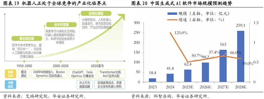 (3)AI基建热度向下游应用扩散仍是重要趋势,关注软件、游戏以及机器人。国内机器人产业正处于大规模应用的临界点。据艾瑞研究院预测,2025年国内机器人市场规模仅有21亿元左右,但到2035年有望达到2833亿元,2028-2030年每年增速将达到60-70%左右,若机器人在核心AI模型或零件领域取得重大突破,市场规模有望远超预测值,可持续布局自动化设备、家电零部件、汽车零部件、电机、通用设备、专用设备等机器人构件制造行业。机器人零部件结构较多,关注价值量较高的相关器件生产企业。机器人产业链主要分为软件和硬件两大部分,软件主要为机器人算法和人工智能算法,集中度相对较高且较为单一,但硬件部分涉及较多方向,其中价值较高的部分主要包括滚柱丝杠、减速器、传感器和电机等等,人形机器人终端需求的快速增长将带动相关零部件厂商业绩增长,可关注自动化设备、家电零部件、汽车零部件、电机、通用设备、专用设备等机器人构件制造行业。AI不仅催生各种软件应用新型需求,也能有效降低开发成本。随着算力堆叠指数级增长,大模型迭代不断加速并催生出软件行业新应用、新模态,同时在开发部署上也具有较强的降本增效功能。例如通过AI代码生成工具可以生成高质量代码同时降低代码编写门槛,调试环节则可快速定位代码错误并及时修复,部署环节则可对相关流程智能监控并及时预警。AI在提高开发效率、减少错误、优化可用资源分配等方面具有革命性优势。据中商产业研究院的预测,2028年我国生成式AI软件市场规模有望达到259.1亿元,2026-2028年同比增速有望维持在60-65%高增速水平。
