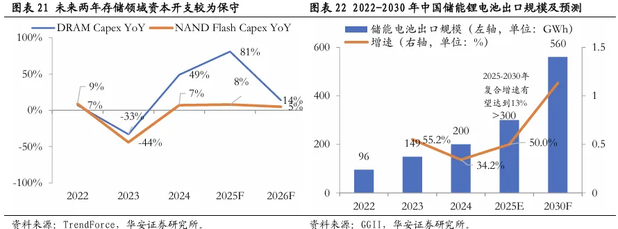 (1)存储:长短期视角下均有景气抬升线索。短期供给侧快速收缩导致存储芯片价格异动。2025年以来各大内存生产商开始将产能和研发重心转向高性能内存模块如DDR5、HBM等高附加值方向转移,新老生产线切换期内供货出现快速收缩,同时由于新技术还未完全成熟等原因,未来新一代内存产能扩充也偏慢,受减产及产能扩充较慢预期影响,存储芯片价格于2025年下半年持续上涨,部分NAND、DDR4产品价格于2025年内最大涨幅超过50%。长期受益于AI训练需求激增。AI推理数据处理中存储至关重要,存储市场有望进入长期景气阶段。AI大模型的训练中,存储性能直接影响AI模型的训练效率,从而间接作用于成本。根据YoleGroup的推测,到2030年HBM市场规模将达到980亿美元,NAND市场规模将达到1010亿美元,HBM、NAND市场规模2024-2030年年均复合增速分别有望达到33%、7%左右,长期看存储半导体受益于AI增长,正处于一轮大景气上行周期中前期阶段。(2)储能链:海外需求进入快速增长期,锂电全产业链量价持续改善。受行业下游旺盛需求带动影响,电池产业链价格均出现不同程度的上涨。2025年锂电池下游需求呈高速增长态势,业绩改善可期。锂电池景气度受动力、储能需求双增长催化持续上行,其中海外储能方向的需求增速相较之下优势更加明显。据GGII统计,2025年储能电池海外出货同比增速有望超过50%,亚、非拉、东欧等新兴市场需求也呈高增态势,据CNESADataLink不完全统计,2025H1中国储能企业新增海外订单规模同比增速高达246%。能源金属景气度持续攀升,锂电材料跟随受益。碳酸锂供给格局好转,“反内卷”预期叠加上海内外部分矿产停产背景下供给侧出现阶段性扰动,短期价格快速上涨,需求侧看,受益于储能等下游方向需求回暖且有一定持续性,中期也具备价格上涨预期支撑。基础化工领域的锂电材料板块也呈同步改善态势,尤其是正极材料、电解液等电池关键材料,与之相关的磷、氟化合物价格从8月开始便进入上行通道,后续有望持续受益于锂电链条景气度回升。