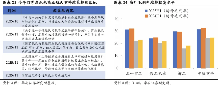 (3)军工:关注受益于商业航天概念持续发酵背景下的投资机会。商业航天政策快速落地,军工板块持续受益。2025年四季度以来,商业航天政策持续落地,2025年10月“十五五”规划建议中将商业航天列为了战略性新兴产业集群重点发展方向,随后于11月的《关于进一步促进民间投资发展的若干措施》中进一步放宽了民间投资在商业航天方向上的限制,随后于11月末国家航天局又宣布已设立商业航天司,商业航天方向上的重磅政策不断落地带动相关板块交投热度快速升温,军工作为明显受益于事件驱动的板块在航天主题带动下有望持续受益,关注航天装备、航空装备、军工电子等细分领域。(4)机械设备:外需进入上行周期;关联概念众多,机器人、商业航天等都有望对其形成催化。工程机械头部企业2024年出口占营收比进一步提升,企业出海加速。东南亚、亚洲等新兴市场基建需求快速增长,已成为我国工程机械出口的重要增长极。从供给端看,国内工程机械厂商近年来积极推动国际化战略,加速海外布局。从4家头部工程机械企业海外营收占比边际变化上看,2024年海外营收较2023年40-60%高增速基础上均有进一步提升,2024年三一重工、中联重科海外营收占比已超过50%。挖机海外毛利率水平高,海外需求回升有望带动利润提升。海外需求回升将有效带动工程机械主机厂利润回升,2025、2024年中报显示,四大主机厂海外毛利平均比境内高出8个百分点左右,未来在国内头部工程机械加速出海,营收占比进一步扩大的基础上,工程机械板块业绩预计将继续回升。机械设备板块关联概念较多,有望受益于多方面催化。机械设备板块中包括部分参与液压、轴承以及航天传动研发生产的企业,设计机器人、商业航天等近期多个热点方向,后续相关概念有望持续对机械设备板块形成催化。