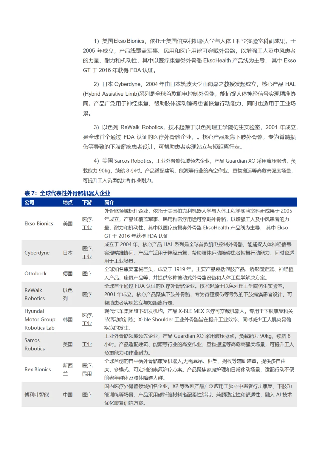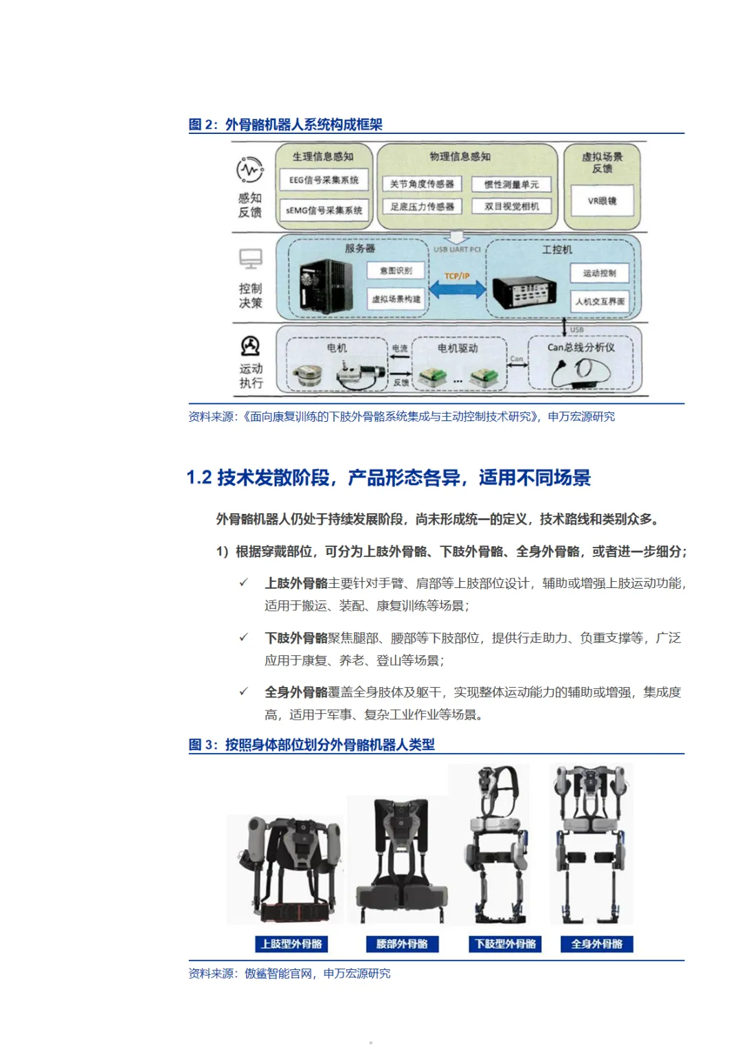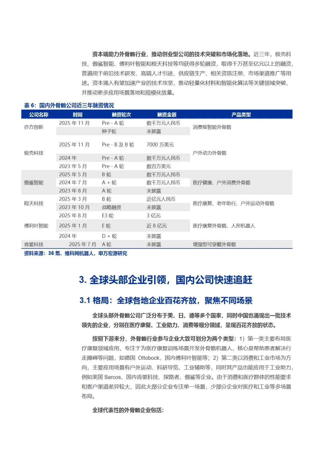 本篇行业报告可以通过扫下方知识星球下载。39元就可以下载星球所有报告。免费提供报告查找服务。外骨骼机器人正从实验室走向大众生活。作为穿戴于人体外部的智能助力设备,它通过传感器捕捉肌电信号、关节角度等生物信息,经控制系统实时处理,驱动机械结构协同人体运动,实现力量增强、负重支撑与康复训练等功能。当前行业仍处于技术发散阶段,产品形态按穿戴部位、驱动方式、应用场景等维度高度分化,尚未形成统一标准。市场需求呈现从专业领域向消费级市场延伸的清晰趋势。医疗康养是最大应用场景,面对我国超3亿老年人口和2800万脑卒中患者的庞大基数,外骨骼在康复训练与生活辅助领域前景广阔。工业领域聚焦物流、汽车制造等重体力场景,致力于降低工伤风险、提升作业效率。军用场景契合单兵装备轻量化与战斗力增强需求。民用消费领域则开辟登山徒步、日常出行等新蓝海,泰山景区试点租赁模式已获游客热捧。据测算,中期潜在市场规模达195亿元。其中康养市场70亿元、工业市场50亿元、军用市场25亿元、民用消费市场50亿元构成核心增量。然而行业仍面临技术瓶颈与商业化挑战:系统响应延迟、续航仅2-4小时、轻量化与性能矛盾等问题待解;专业设备售价超百万元,消费级产品也需数千元,成本制约规模化普及。政策与资本双轮驱动产业加速突破。2025年IEC发布的养老机器人国际标准由我国牵头制定,《"机器人"应用行动实施方案》等政策明确支持外骨骼在养老服务场景验证。近三年极壳科技、傲鲨智能、傅利叶智能等企业获数亿元融资,推动技术迭代与场景落地。竞争格局呈全球百花齐放之势。海外龙头Ekso Bionics、Cyberdyne、ReWalk Robotics深耕医疗康复与工业领域,技术积累深厚。本土企业快速崛起:傅利叶智能以医疗康复机器人为核心,服务全球60余国;傲鲨智能覆盖工业与消费双场景,产品亮相《流浪地球2》;肯綮科技聚焦登山助力,在泰山景区实现商业化验证;极壳科技将消费级产品降至千元价位,年出货数万台。随着芯片、固态电池、碳纤维材料等核心技术突破,叠加产业链协同优化,外骨骼机器人正从"能用"迈向"好用"。未来谁能在人机协同精准性、结构设计灵活性与场景适配能力上建立护城河,谁就能在这场人与机器深度融合的产业革命中抢占先机。免责声明:以上分享报告为公开合法渠道获得,内容大部分来源于网络,版权归原作者所有,如有侵权,请及时与我们联系,我们将第一时间保障您的权益。推荐内容仅供参考学习,不构成投资建议。