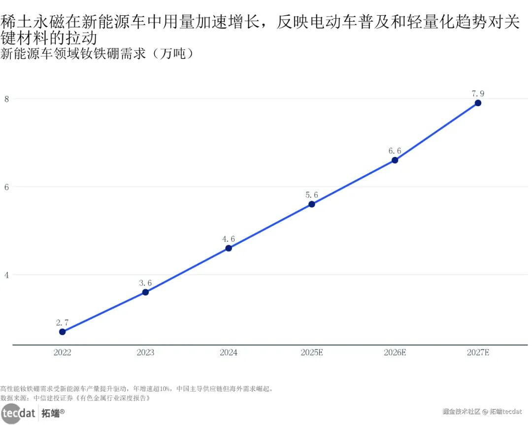 新能源车领域钕铁硼需求增长折线图表1新能源车领域钕铁硼需求增长折线图表1数据及PDF模板已分享到会员群钕铁硼这东西,说简单点就是“让电机转起来的关键”——机器人每个关节都要装,单台人形机器人大概要2-3kg,新能源车驱动电机也离不开它。2025年全球新能源车用钕铁硼需求已经飙到201万吨,2026-2028年还会以2.3%-2.9%的速度涨(中信建投证券数据)。现在北方稀土、金力永磁的产能都满负荷了,谁有产能谁就能拿到订单。