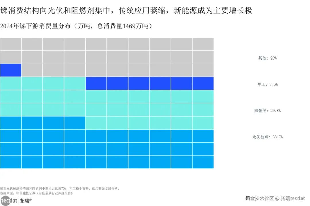 2024年锑下游消费结构华夫图表22024年锑下游消费结构华夫图表2数据及PDF模板已分享到会员群你可能没听过锑,但AI服务器的阻燃材料、光伏玻璃的澄清剂都离不开它。2024年锑的需求里,45%是阻燃剂(AI服务器算力越高,越需要阻燃),24%是光伏玻璃(全球装机量涨,锑需求跟着涨)(中信建投证券数据)。更关键的是,中国锑精矿产量占全球81%,2025年还出了出口管制,国内价格肯定会涨,湖南黄金、华钰矿业这些有矿的企业要重点盯。
