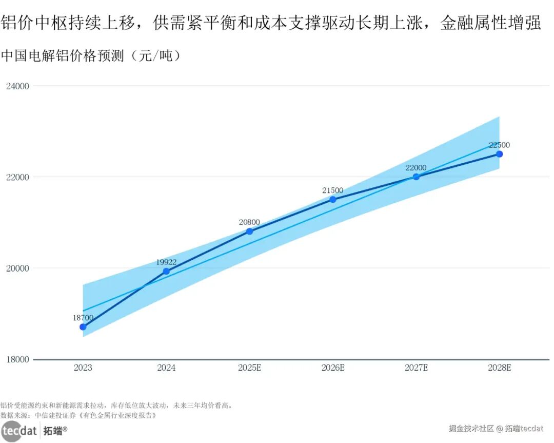 中国电解铝价格预测折线图表5中国电解铝价格预测折线图表5数据及PDF模板已分享到会员群铝最轻,机器人要想灵活移动,本体就得用铝;新能源车车身也靠铝减重。2026-2028年全球电解铝均价会涨到21500元/吨、22000元/吨、22500元/吨(中信建投证券数据)——为啥涨?中国产能锁死在4545万吨,海外复产跟不上,需求又涨,供需紧平衡下,中国宏桥、云铝股份的利润会越来越厚。