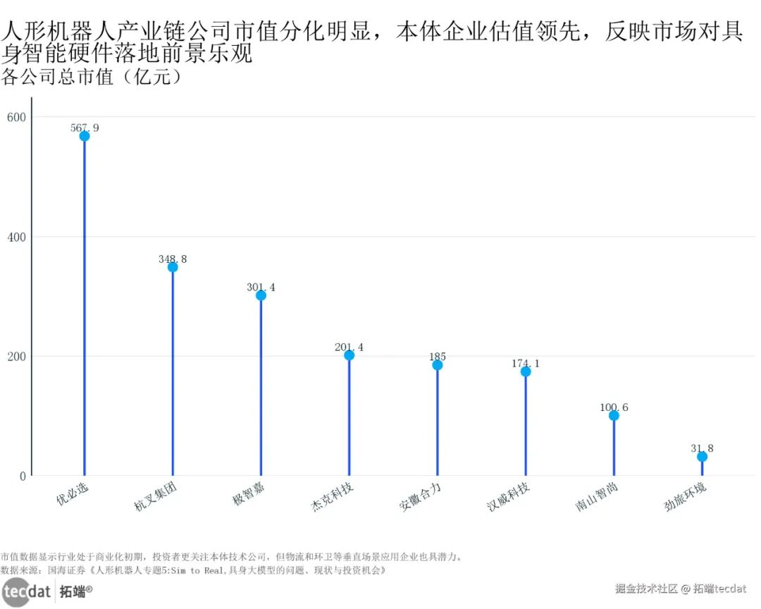 人形机器人产业链公司总市值刻度线图表10人形机器人产业链公司总市值刻度线图表10数据及PDF模板已分享到会员群现在市值最高的是优必选(567.91亿元),极智嘉(301.43亿元)、杭叉集团(348.80亿元)紧随其后(国海证券数据)。为啥本体企业市值高?因为现在是商业化初期,投资者更看好“能做出整机的公司”;但长期看,减速器、电机这些核心零部件企业会跟上——毕竟机器人量产了,零部件需要量会更大。