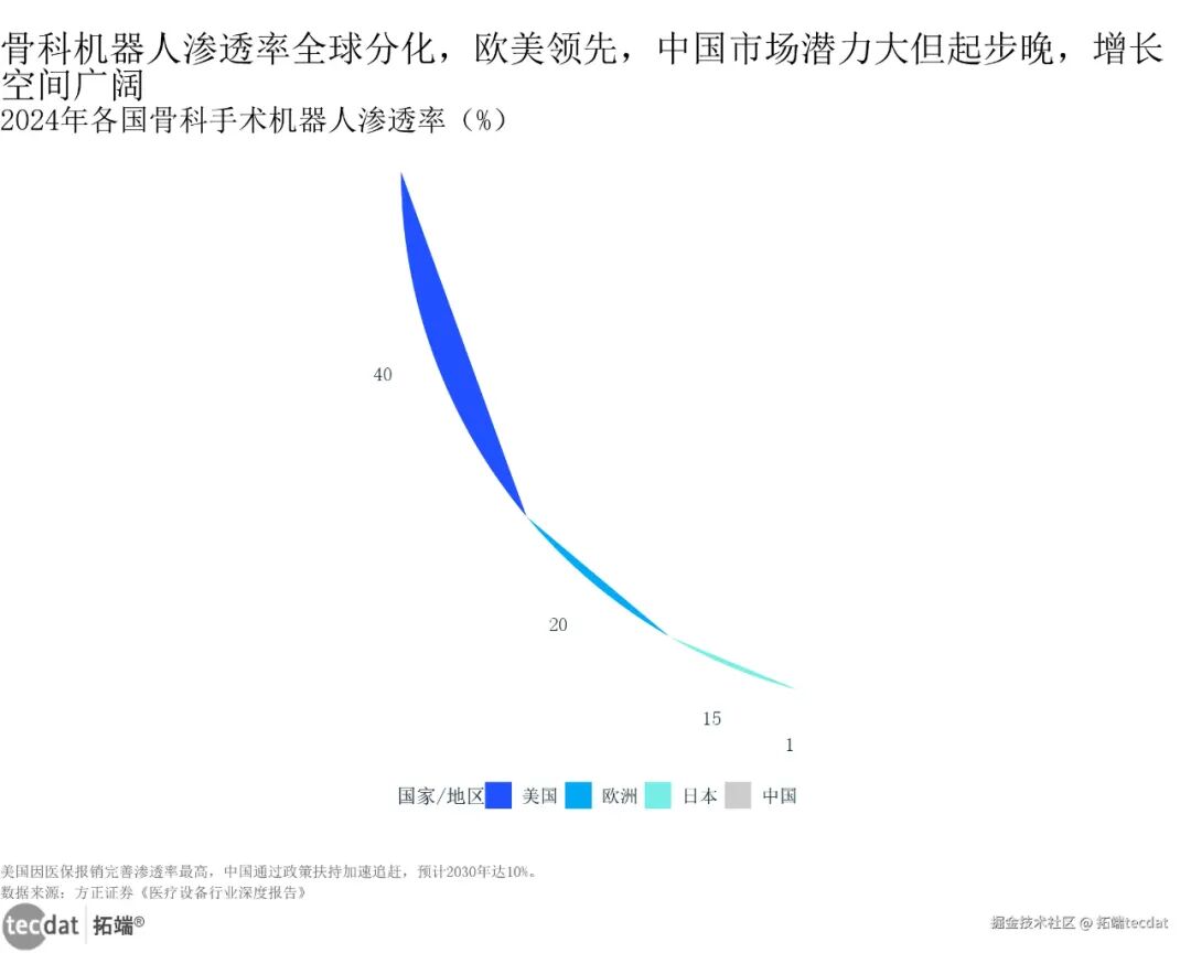 2024年各国骨科手术机器人渗透率半圆面积图表42024年各国骨科手术机器人渗透率半圆面积图表4数据及PDF模板已分享到会员群2024年中国关节置换手术用机器人的比例还不到1%,美国2026年预计能到19.4%(方正证券数据)。差距在哪?美国Medicare全额报销机器人手术费,中国才23个省份把费用纳入收费目录(8000-40000元/台),患者自费不少。但好消息是,江西、北京已经试点报销,等全国覆盖了,渗透率肯定会跳涨。