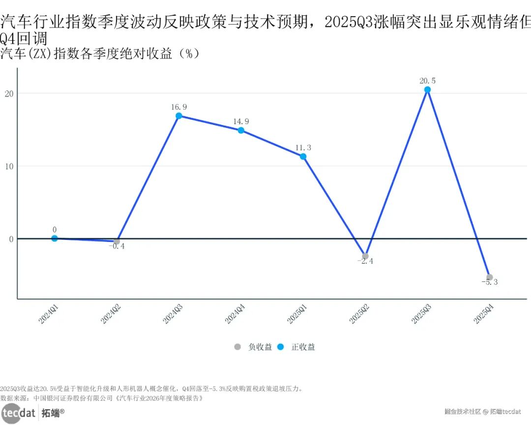 汽车行业指数季度绝对收益折线图表7汽车行业指数季度绝对收益折线图表7数据及PDF模板已分享到会员群2025年Q3汽车(ZX)指数涨了20.5%,很大原因是“机器人概念”带的(中国银河证券数据);Q4虽然跌了5.3%,但长期看,拓普集团、三花智控这些车企供应链企业,已经开始做机器人关节、热管理部件,技术复用能降低成本,比纯做汽车零部件更赚钱。