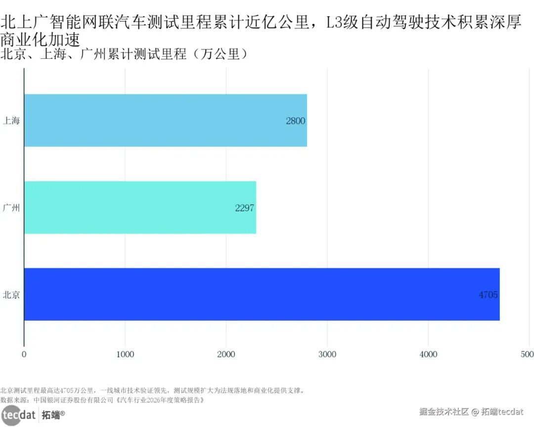 北上广智能网联汽车累计测试里程水平条形图表9北上广智能网联汽车累计测试里程水平条形图表9数据及PDF模板已分享到会员群北京智能网联汽车累计测试了4705万公里,上海2800万公里,广州2297万公里(中国银河证券数据)。这些测试不是白做的——智能网联的AI算法、传感器技术,能直接用到人形机器人上,比如机器人“看路、避障”,跟汽车“自动驾驶”原理差不多,技术协同能省研发钱。