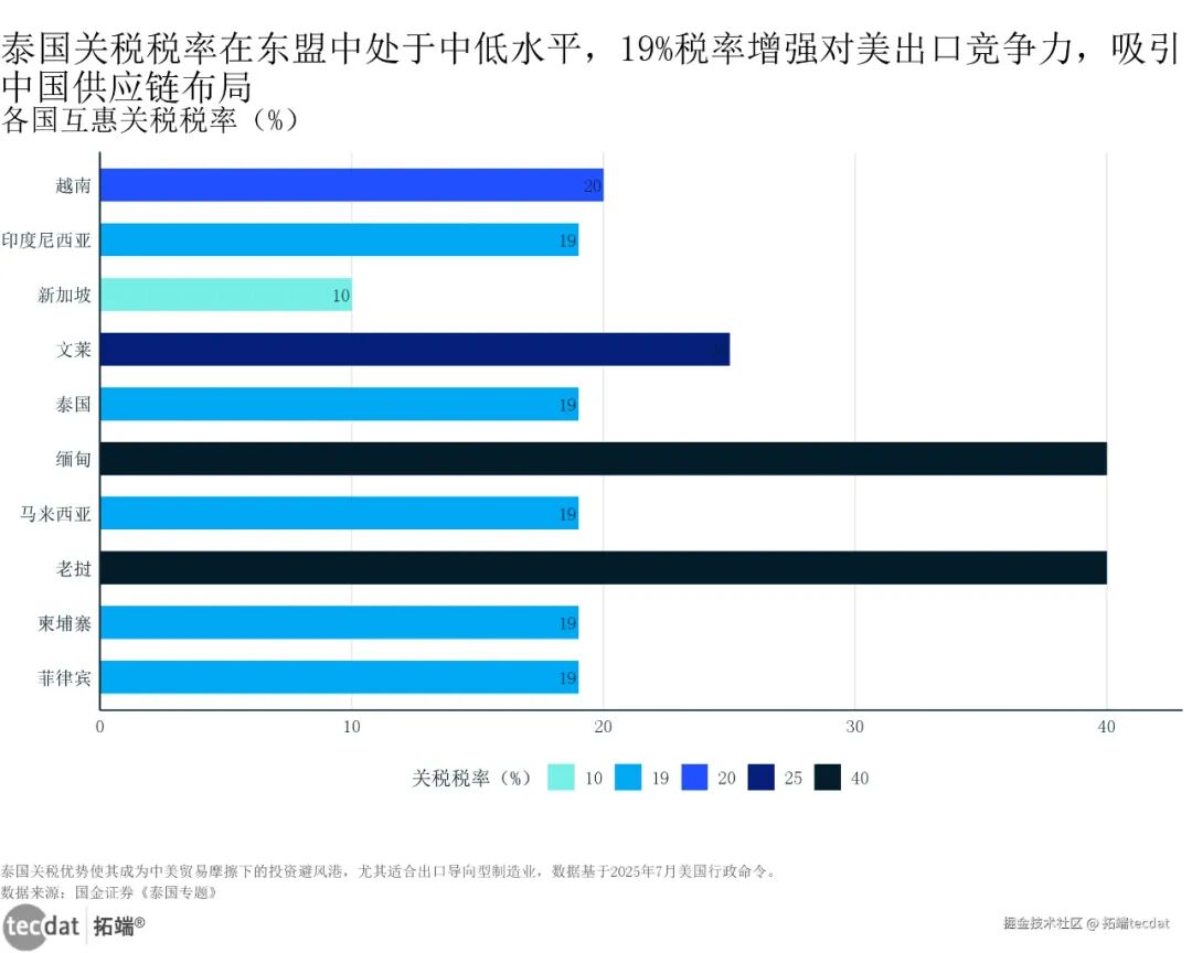 东盟各国互惠关税税率水平条形图表11东盟各国互惠关税税率水平条形图表11数据及PDF模板已分享到会员群美国对泰国的互惠关税是19%,比越南(20%)、老挝(40%)都低(国金证券数据)。更关键的是,泰国还把“区域价值成分(RVC)”门槛提到50%,避免“假出口”,中企在这生产的机器人,对美出口不用担心关税风险。