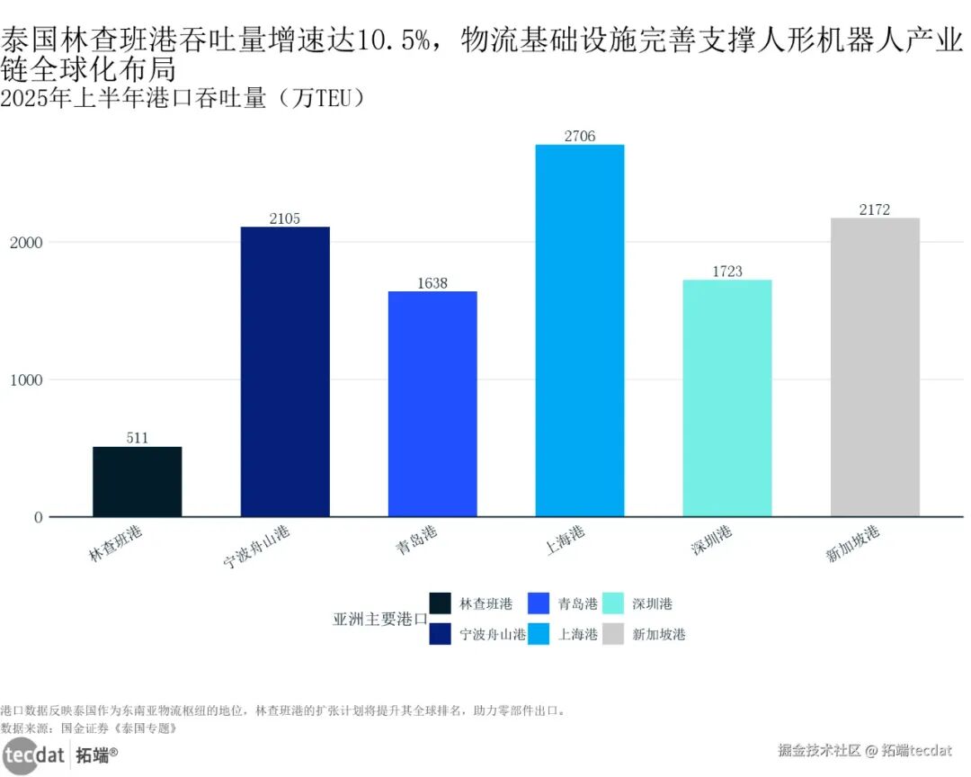 2025年上半年港口吞吐量条形图表122025年上半年港口吞吐量条形图表12数据及PDF模板已分享到会员群泰国林查班港2025年上半年吞吐量511万TEU,同比涨10.5%,已经进全球前20(国金证券数据)。这个港正在扩建,三期完成后吞吐量能从1100万TEU涨到1800万TEU,机器人零部件进出口更方便,物流成本比从国内运到美国低10%-15%。