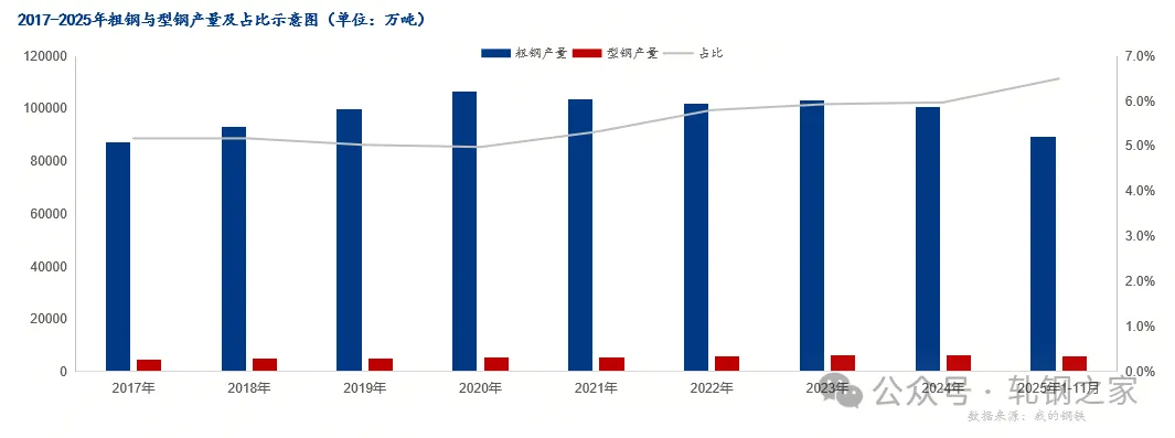 图:2017-2025年型钢在粗钢中占比示意图 数据来源:钢联数据