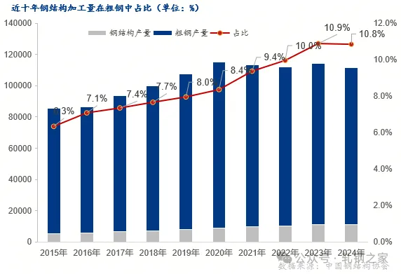 机械制造用钢作为工业基础材料,其消费情况与中国制造业景气度及固定资产投资密切相关。2025年9月中国钢材表观消费量达11429.23万吨,处于年内高位,显示短期需求韧性。但月度数据波动显著,表明行业周期性明显,对热轧型钢用量有一定支撑。(6)钢结构承接H型钢为主的热轧型钢品种主要消费2015年至2024年粗钢由8.04亿吨增加到10.05亿吨,增长25%;而钢结构由5100万吨增加到10900万吨,增长113.7%;钢结构平均增速显著高于粗钢增速,钢结构推广成效明显,产量连续三年超过1亿吨;2024年钢结构产量首次出现下降趋势,比2023年下降2.68%;近10年钢结构占粗钢比例逐年增加,2024年比2023年稍有下降;