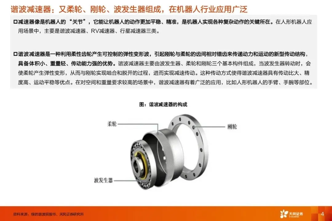 谐波减速器是一种利用柔性齿轮产生可控制的弹性变形波,引起刚轮与柔轮的齿间相对错齿来传递动力和运动的新型传动结构,具备体积小、重量轻、传动能力强的优势,一般用于人形机器人的手臂、手腕等部位。