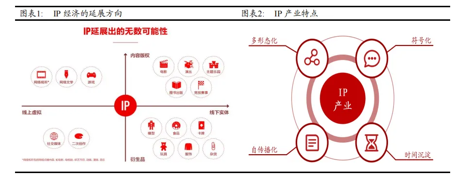 IP定义不断扩展,其特点主要为多形态化、符号化、自传播及时间沉淀。IP(Intellectual Property,知识产权)指的是创作者或权利人对其文学、艺术及科学创作成果所享有的专属权利。随着文化创意产业的发展,IP的内涵逐步泛化,从传统法律定义延伸为一切具备独创性、并能被市场接受与法律保护的内容资产,典型如小说、漫画、影视作品及游戏角色等具象创作。在IP经济发展的早期阶段,内容创作多遵循“内容即产品”的逻辑,商业化路径主要通过出版、播放与基础授权实现,形式较为单一。进入互联网时代后,IP的定义进一步扩展,凡具备自主吸引力、持续流量能力与衍生开发潜力的内容,均可被视为IP。
