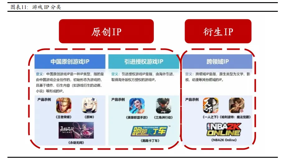 游戏IP的来源具有多元性,可分为原创IP及衍生IP。游戏IP具体涵盖游戏产品中经明确界定与保护的特定角色形象、完整世界观架构、连贯故事情节及专属品牌标识等核心元素。这些元素相互关联、有机融合,不仅共同塑造了游戏的独特艺术风格与核心辨识度,更通过沉浸式的体验设计,为玩家构建起兼具情感共鸣与探索乐趣的虚拟场景,成为吸引用户、维系用户粘性的关键所在。游戏IP的来源具有多元性,既包括游戏研发团队自主创作的原生内容,凭借独特的创意设定形成差异化竞争力,分为中国原创及引进授权两大类,也涵盖基于文学名著、影视佳作、经典动漫等其他文化形态进行改编衍生的内容。