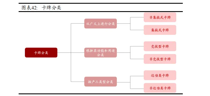 集换式卡牌占据卡牌市场重要组成部分。对于卡牌市场来看,行业内普遍采用多维度交叉的方式对产品形态进行分类。较为通行的观点通常从三条路径进行划分:从广义上进行分类,卡牌可分为“集换式”与“非集换式”两类,其中集换式卡牌具备卡片收集、交易与构筑属性,是当前市场主流;从功能和用途层面上进行分类,卡牌产品可再划分为“竞技型”与“非竞技型”,前者强调策略性与对抗体系,适用于具备长期运营能力的对战环境,后者则多用于IP内容的呈现与纪念价值延展,强调收藏属性;从产品类型分类,又可区分为“运动类”与“非运动类”,其中运动类以球星卡、赛事纪念卡为代表,融合体育文化与粉丝经济逻辑,而非运动类则广泛覆盖动漫,游戏等IP内容。